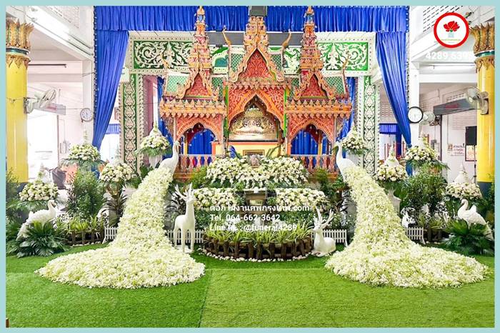 รูปแบบ ดอกไม้หน้าศพ ดอกไม้งานศพ ดอกไม้หน้าหีบ ดอกไม้ประดับหน้าเมรุ ประดับนกยูง สวนงานศพ สวยงาม ทันสมัย โมเดิร์น ราคามิตรภาพ